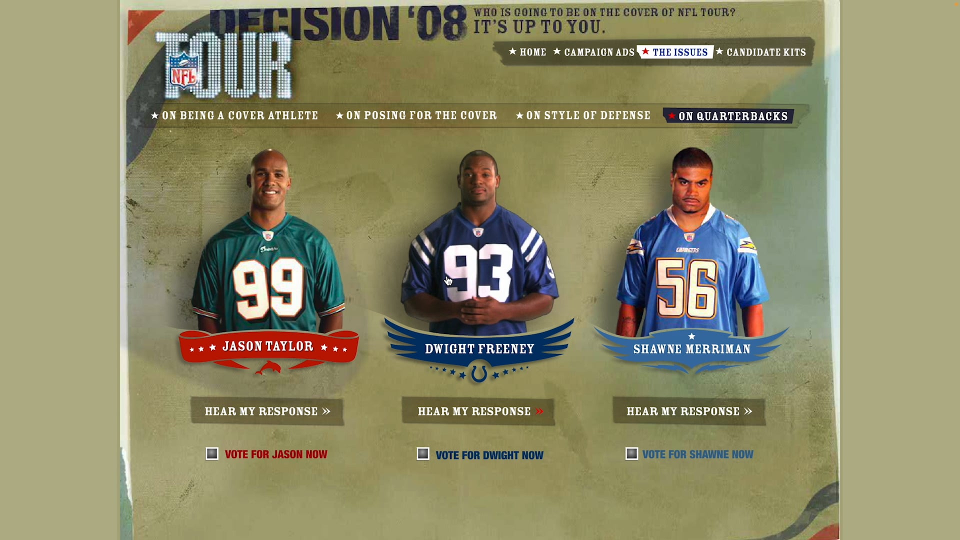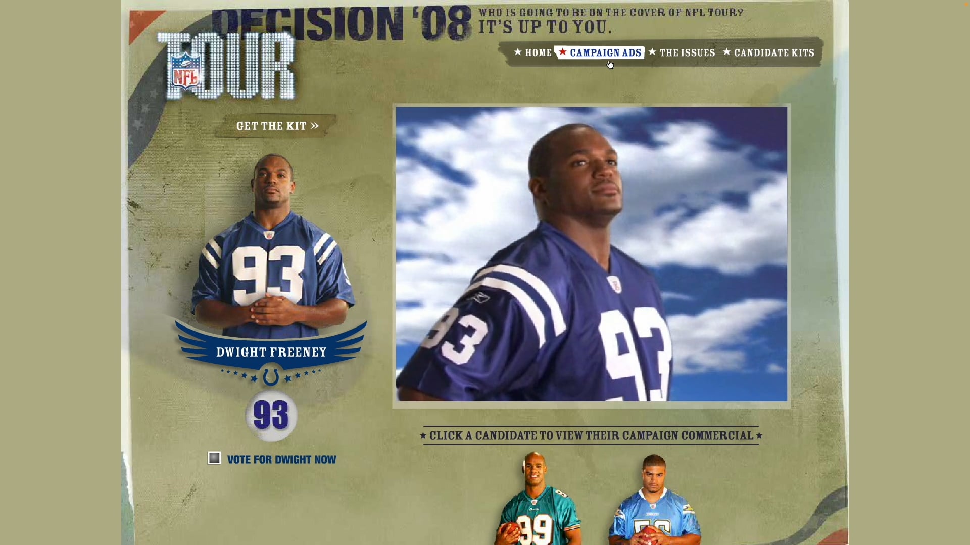 CAMPAIGN EA was releasing a new NFL game and needed to build a fanbase. We figured the fastest way was to piggyback onto the existing fanbases of athletes, who were already being considered for the cover of the defensive-forward game, by letting the fans decide. With the release date coinciding with an election year, it was a no-brainer to mimic our presidential election campaigns for the candidates, complete with campaign pitches, ads, debates, slogans, swag, and a place to cast your vote. In the end, letting the fans choose and support their candidate through the election cycle, immediately gave EA a vested fanbase they needed for the game’s launch. SPECS Timeline: 12 weeks Deliverables: Experiential Microsite / :30 x3 / Radio / Rich Media Digital Ads Success Metrics: Create Buzz for NFL Tour / Build Voter Base for Cover Athlete / Increase Site Traffic RESULTS Hundreds of thousands of site views >8 min avg site visit >30K votes cast within hours First game to let fans vote for cover: later adopted by Madden and FIFA